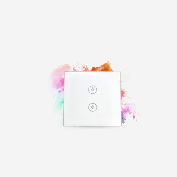 Interruptor duplo com controlo WiFi através da aplicação Aron Smart para Android e iOS. Através da aplicação pode, por exemplo, ligar/desligar o interruptor remotamente e marcar horários de funcionamento.