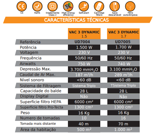 A nova geração de aspiração central.Com alto rendimento mas com baixo consumo de energia,a elegante gama VAC³ oferece três opções de filtração diferentes: a combianação de filtros HEPA y PROTECTA, un filtro autolimpante e uma opção de um saco de filtro. VAC³ está disponivel com dois motores distintos: 1.5kW o 1.7kW – e em ambos, uma versão dinâmica ou digital (ecrã digital) para eleger.